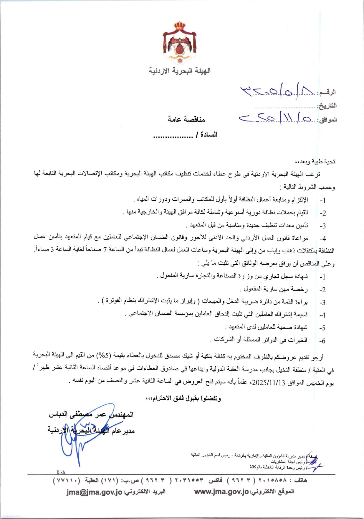 مناقصة عامة / عطاء لخدمات تنظيف مكاتب الهيئة البحرية ومكاتب الاتصالات البحرية